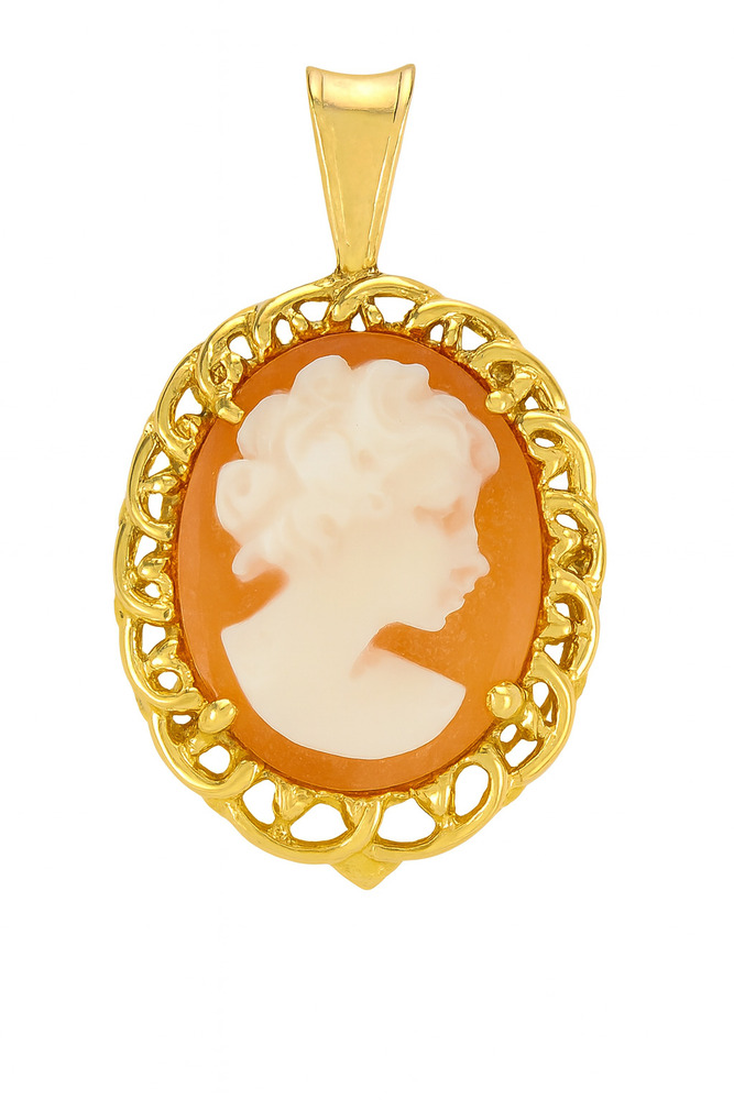 This elegant 10kt gold cameo pendant captures timeless sophistication in a delicate 0.90 grams. Featuring a finely carved profile set against a warm coral background, it’s framed by an intricate gold border that adds vintage charm and classic beauty. A graceful piece that embodies both history and refinement, perfect for any jewelry collection.