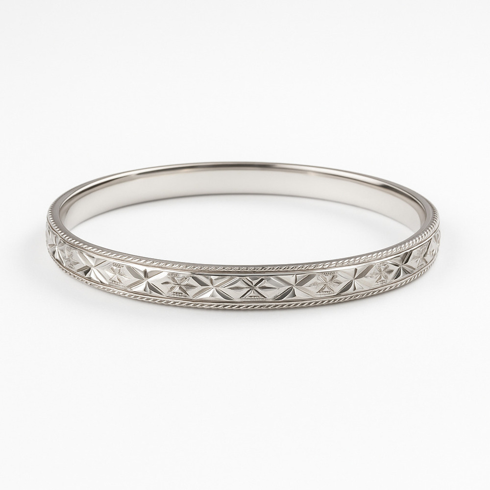 10K white gold bangle weighing 6.60 grams. Beautifully detailed with an engraved geometric pattern that catches the light from every angle. The polished white gold finish gives it a bright, elegant look that stands out on its own or stacked with other pieces. A solid, timeless design and a perfect everyday statement piece.