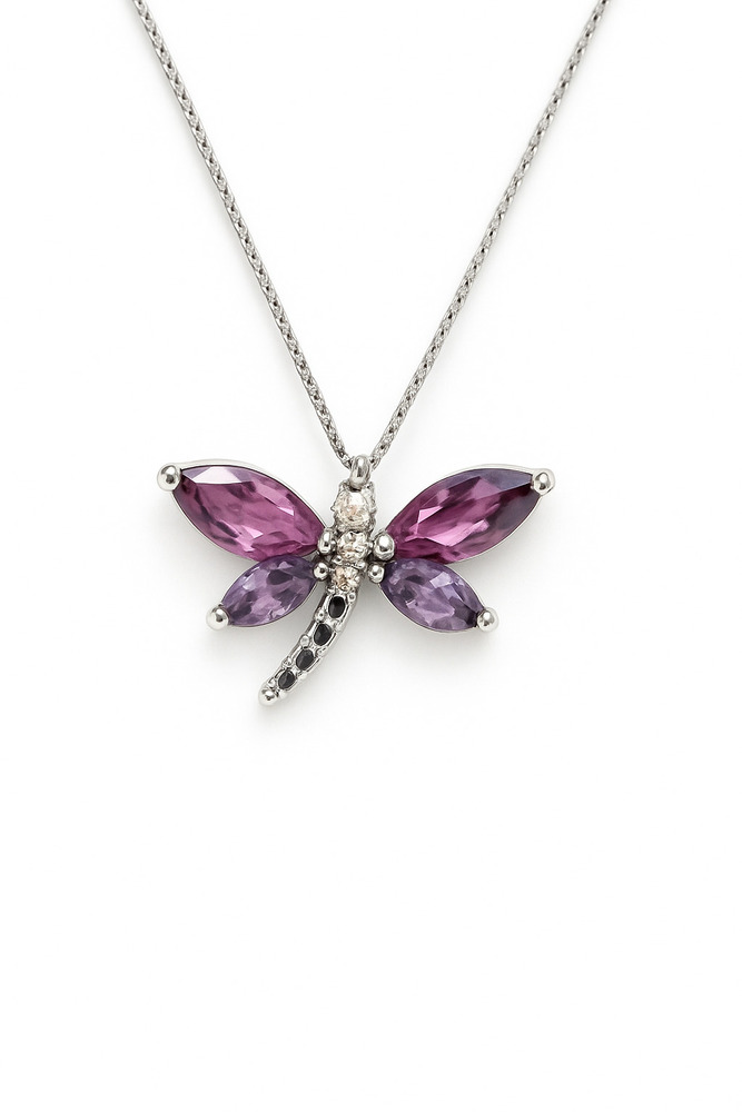 Graceful and elegant, this dragonfly pendant is crafted in 10kt white gold, weighing 2.00 grams. The wings are adorned with sparkling purple stones, beautifully paired with shimmering black and white accents along the body for a striking finish. Suspended from a sleek chain, this piece captures the delicate beauty of a dragonfly while adding a touch of sophistication to your look. Perfect for everyday wear or as a meaningful gift symbolizing transformation and strength.