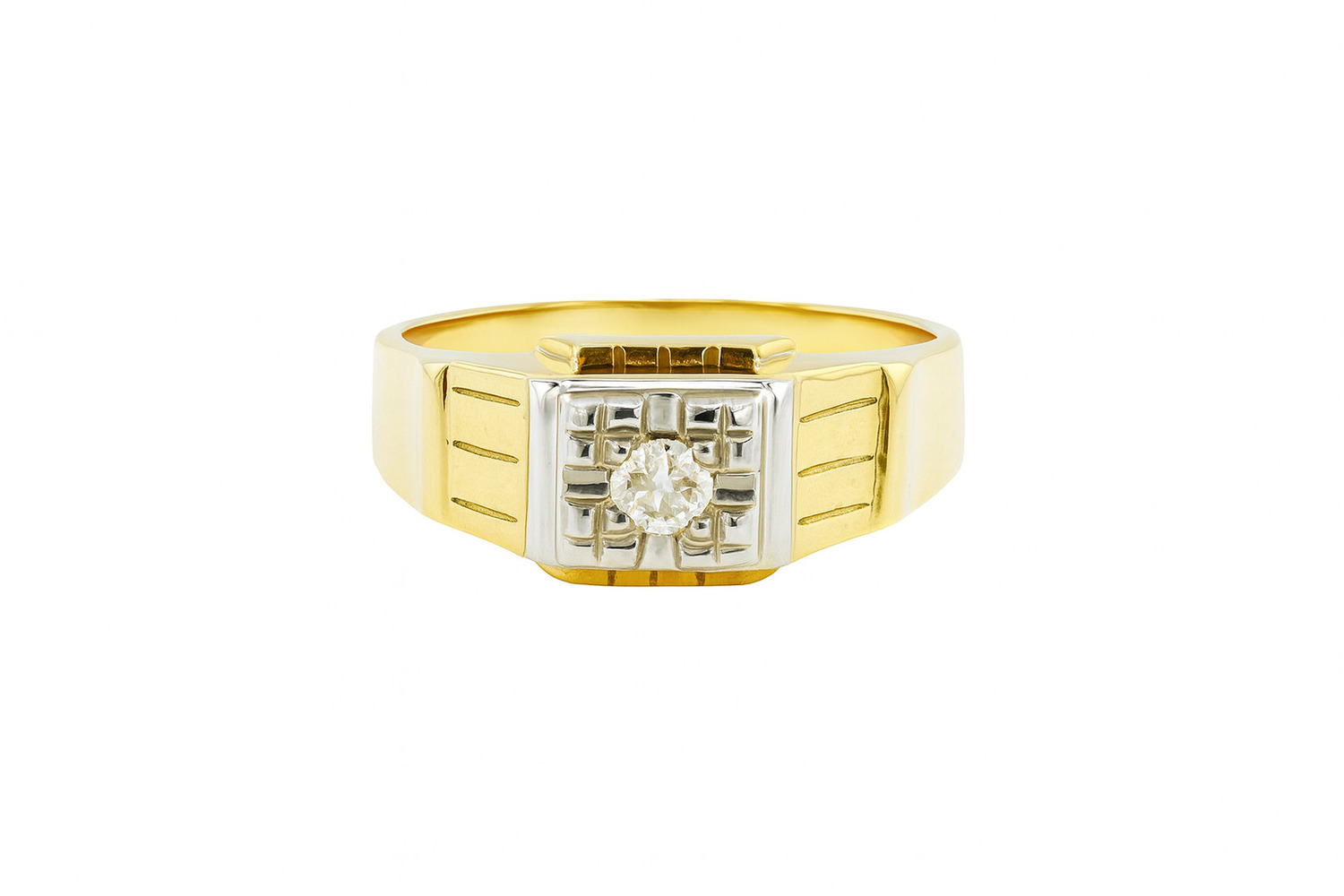10kt yellow gold men’s ring weighing 3.80 grams. Features a raised white gold center with a classic textured grid design and a sparkling diamond set in the middle. Bold shoulders with clean engraved lines and a bright high-polish finish. A strong vintage-style piece with solid gold weight and standout detail.