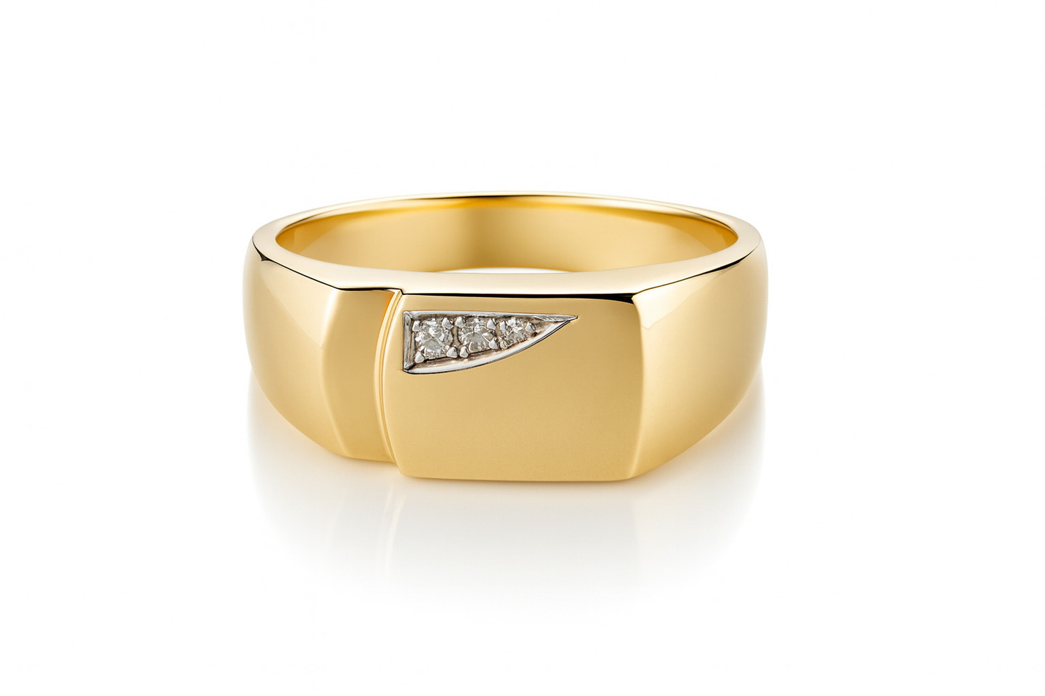 10KT yellow gold men’s ring weighing 6.20 grams. This piece features a modern geometric face with a sleek split-front design and a white gold accented panel set with natural diamonds. The gold has a rich classic 10kt tone with a high polish that gives the ring a bold, elevated look. A solid, well made statement ring that stands out with its clean lines and subtle diamond sparkle. Perfect for daily wear or as a standout gift piece.