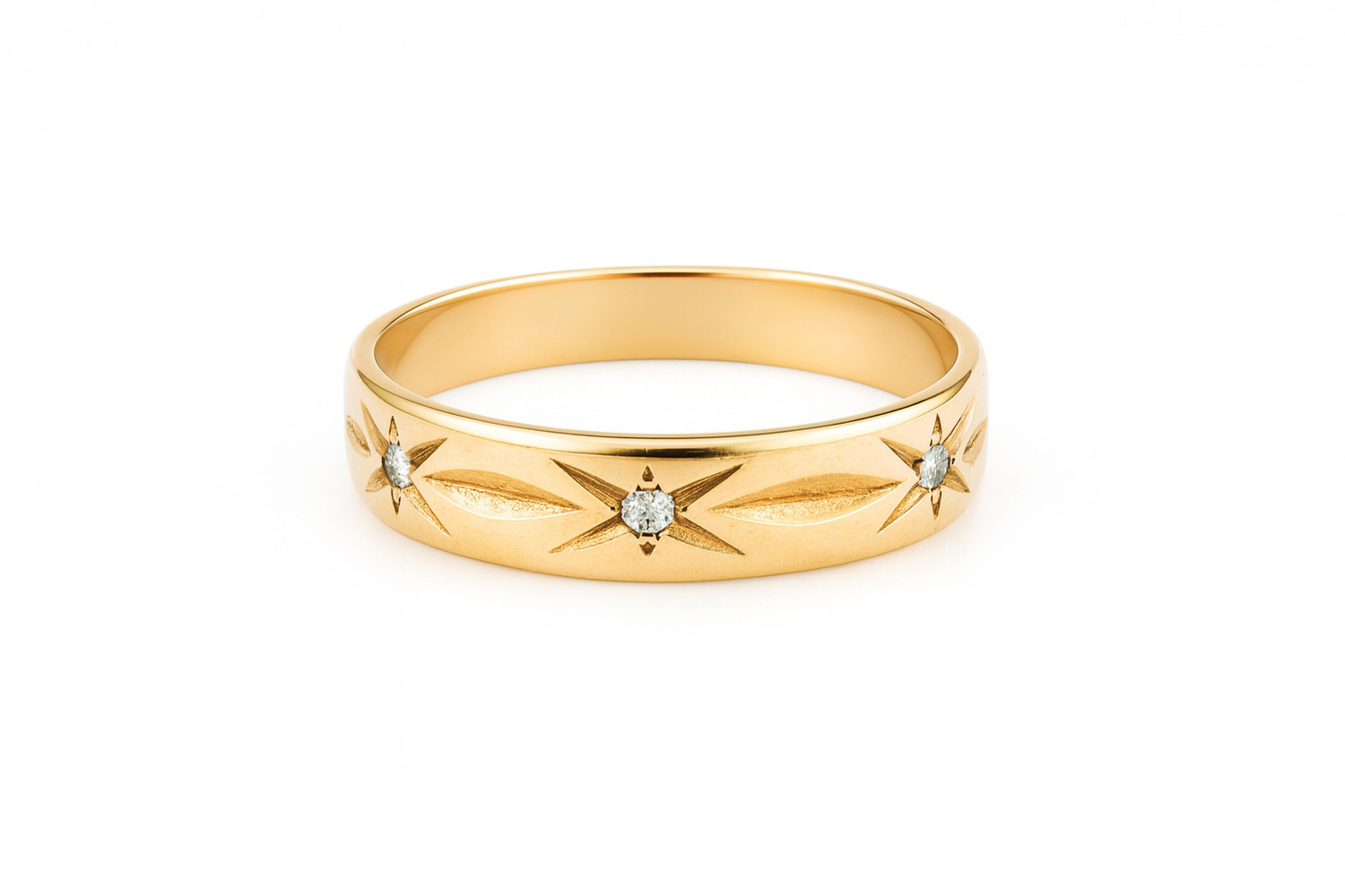 10KT yellow gold band weighing 2.90 grams. This classic ring features a carved starburst pattern across the front with clean, symmetrical detailing that catches the light beautifully. The gold has a warm traditional 10kt tone with a smooth, polished finish. Lightweight, comfortable, and easy to wear every day, this piece is perfect on its own or stacked with other bands.