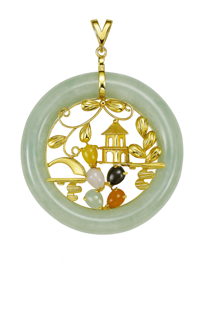 An exquisite work of art blending elegance and tradition, this 14kt yellow gold pendant features a smooth circular jade frame accented with intricate gold detailing. At its center, five vibrant gemstones add a touch of color and harmony symbolizing balance, prosperity, and vitality. Weighing an impressive 22.80 grams, this pendant is a statement of refined craftsmanship and timeless beauty, perfect for those who appreciate luxury with cultural meaning.