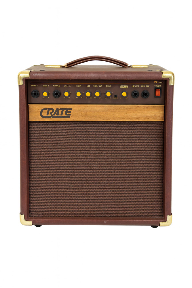 Experience warm natural acoustic tone with the Crate CA 30 a compact and stylish acoustic guitar amplifier designed for rich sound and classic looks. Featuring a 30 watt output dual input channels for guitar and microphone and a built in 3 band EQ this amp delivers balanced clarity whether you are performing recording or practicing. Its vintage wood and leather style cabinet pairs perfectly with the classic Crate logo giving it a timeless stage or studio presence. The built in chorus and reverb effects add lush depth and ambience to your sound while the sturdy handle and protective brass corner caps make it easy to transport and built to last. Ideal for singer songwriters small gigs or home use the Crate CA 30 combines warm acoustic tone rugged build and vintage charm in one portable amp.