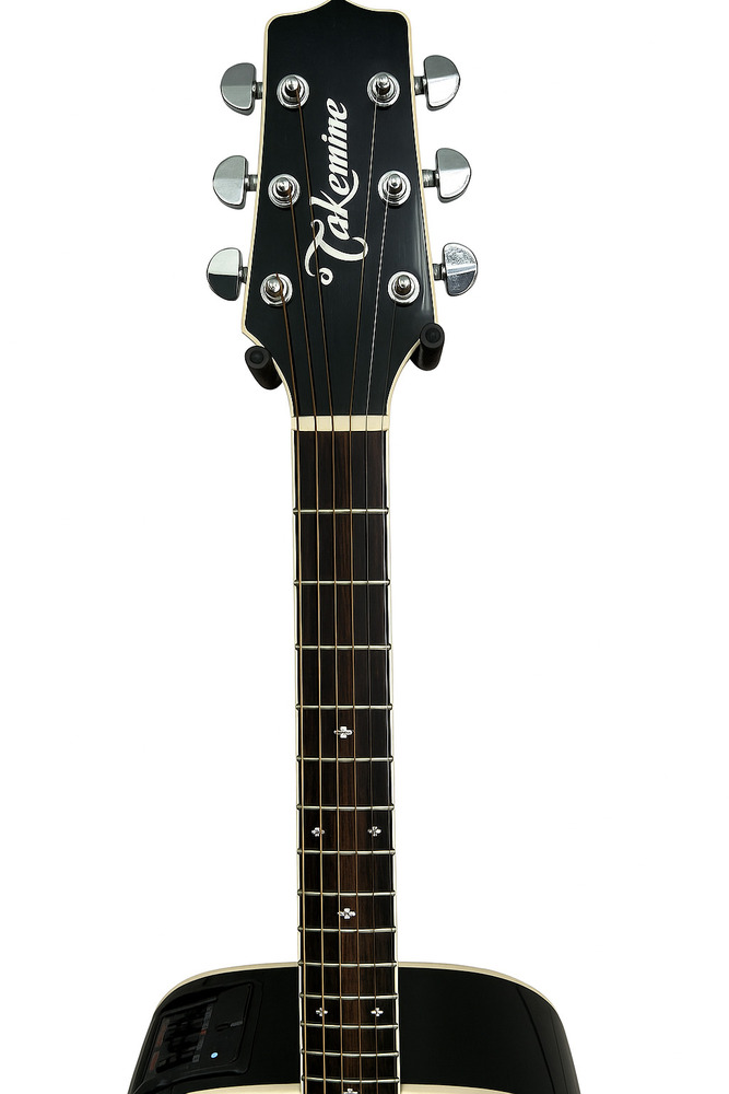 This guitar has been the choice of pro musicians of all genres. The versatility of this guitar begins with its solid cedar top that can play sweet mellow passages or power chords with equal ability. The maple back and sides are a perfect reflector for the tone generated by the soundboard and the gloss black finish looks great under the stage lights. The mahogany neck is joined to the body with a traditional, ultra strong dovetail joint. Includes Takamine's CT4B II preamp system paired with the unique Palathetic under-saddle pickup for peerless amplified response. The highly acclaimed CT4B II preamp system with three-band EQ, volume control and built-in tuner.
